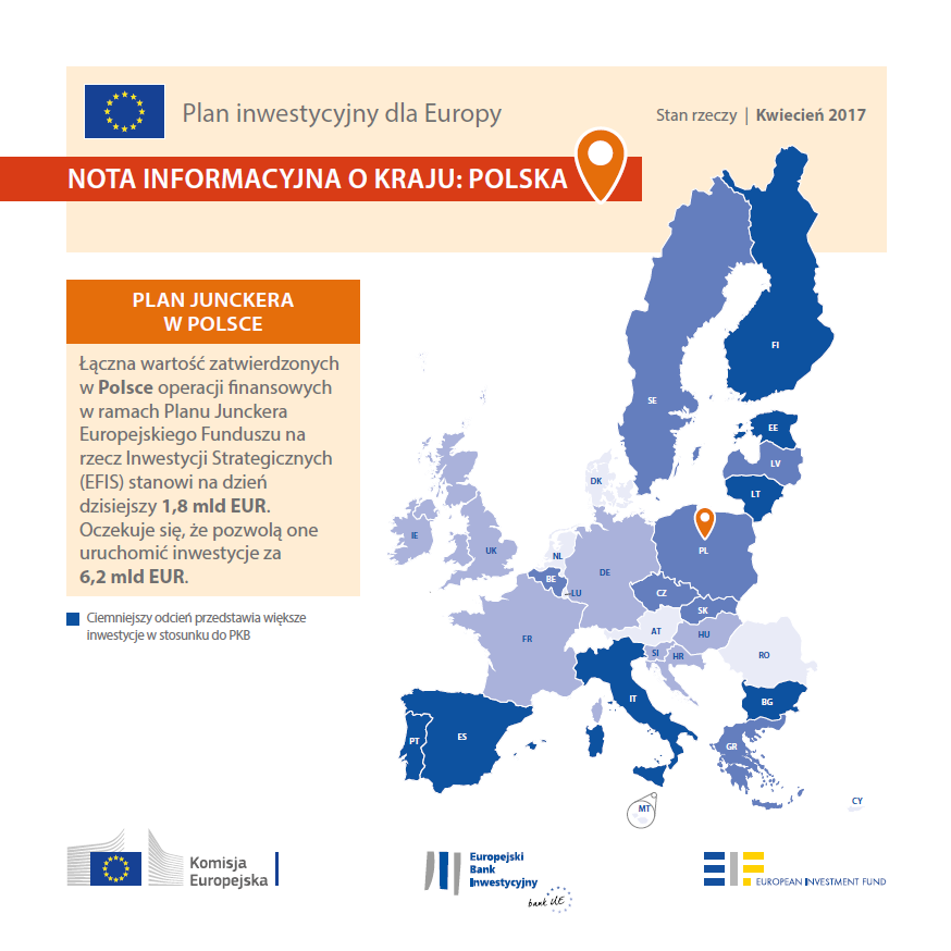 Do chwili obecnej wsparcie EFSI otrzymało 21 projektów związanych z Polską (w tym 6 – międzynarodowych) na sumę 1,8 mld EUR. KE ocenia, że wkład ten wygeneruje łącznie 6,2 mld EUR inwestycji w kraju.